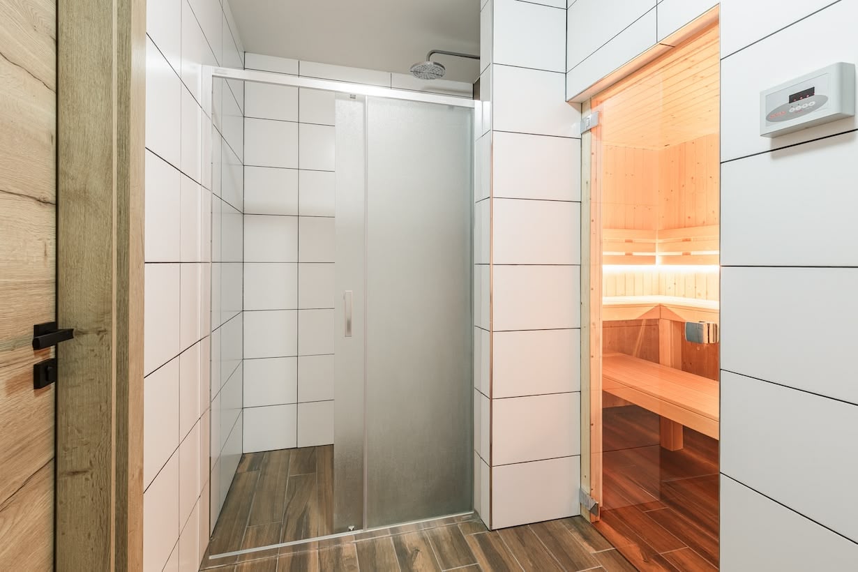 Po dni plném zážitků si můžete dopřát klid a teplo v soukromé sauně. Moderní dřevěný interiér navozuje atmosféru wellness, zatímco přilehlá sprcha a odpočinková část s věšáky a topením na ručníky zajišťují plné pohodlí. Prostor je čistý, prostorný a ideální pro malé skupiny nebo páry, které chtějí načerpat energii a zklidnit tělo i mysl. Sauna je součástí hlavního objektu, takže si ji můžete vychutnat kdykoli během pobytu.