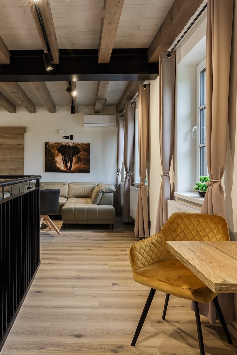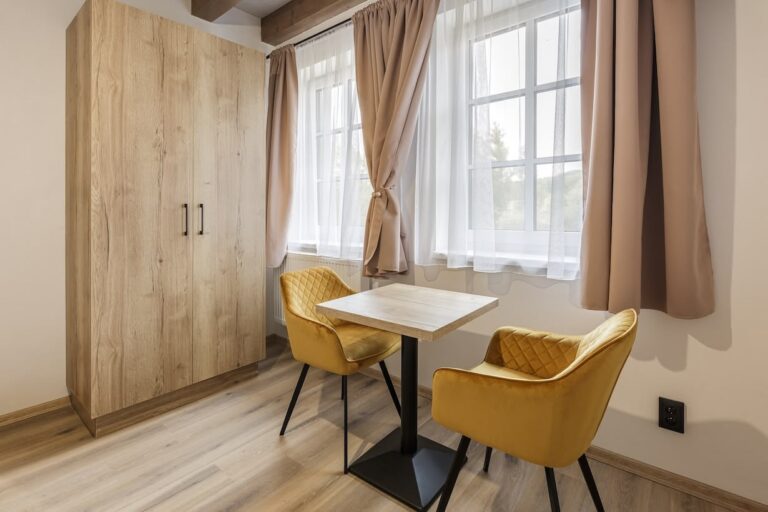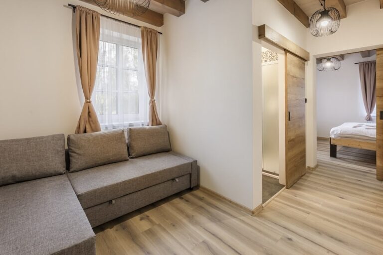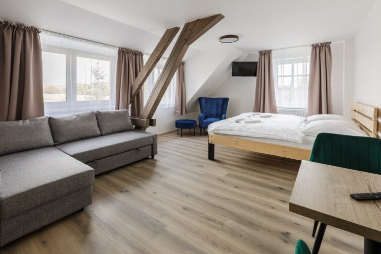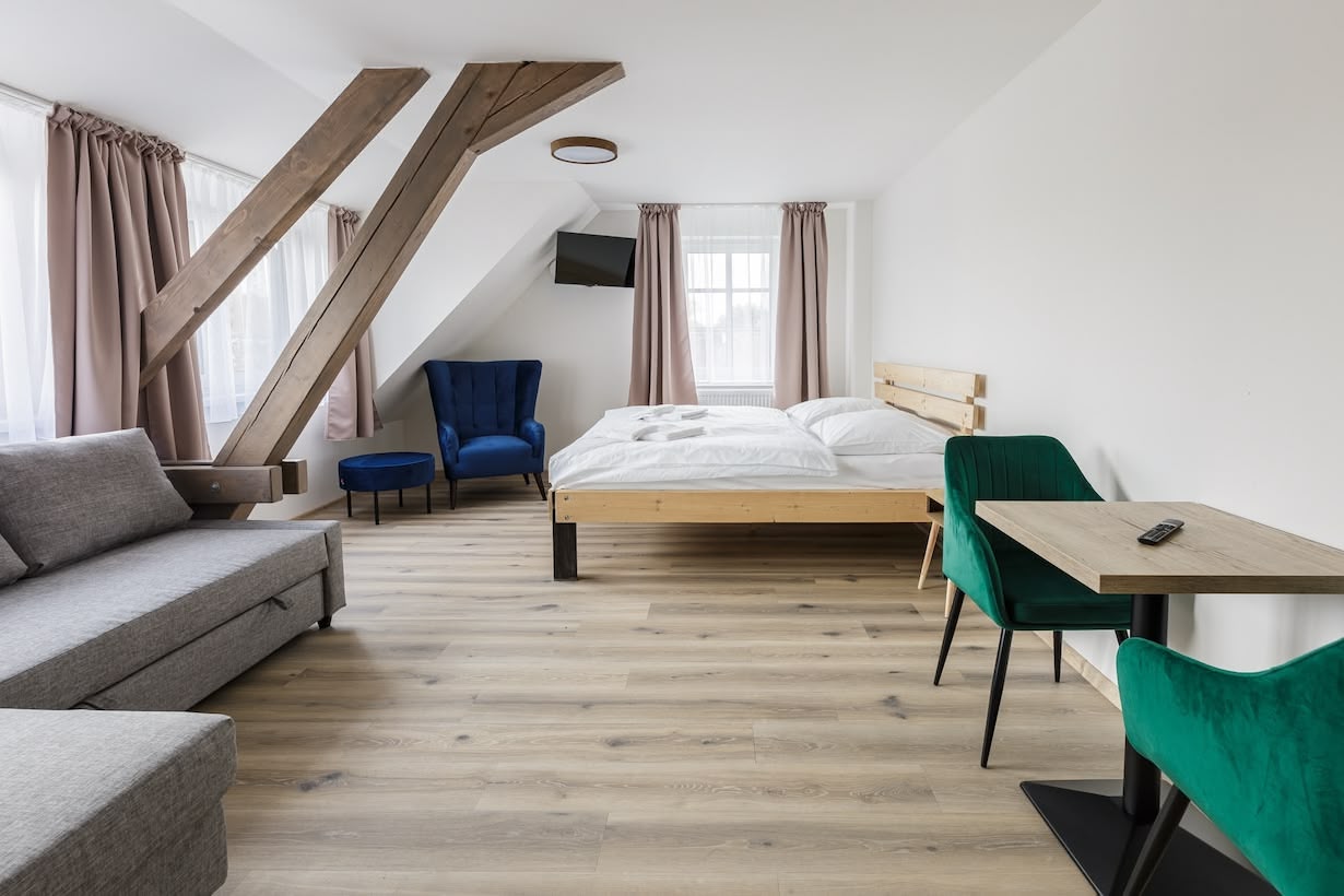 V domě najdete 6 útulných a prostorných pokojů (2x Deluxe, 4x Komfort), které spojují pohodlí s moderním stylem. Každý pokoj nabízí komfortní manželskou postel a rozkládací gauč, který po rozložení poskytne další 2 plnohodnotná lůžka. Interiér působí svěže a klidně díky kombinaci dřeva, světlých barev a dostatku denního světla. Samozřejmostí je vlastní koupelna se sprchou (také osuška, ručník, hygienické potřeby), klimatizace a posezení u okna, odkud si můžete vychutnat výhled do okolní krajiny.