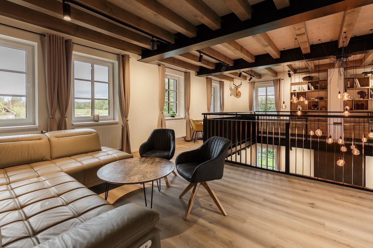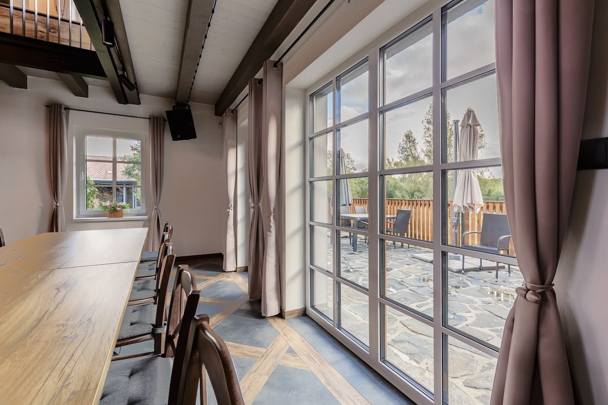 Hlavní srdce celého domu. Prostor, kde se odehrávají svatby, oslavy i firemní večery. V našich prostorách lze usadit až 70 osob a nabízí vše, co je potřeba pro pohodlné setkání – vlastní bar, kvalitní ozvučení, osvětlení i velkou TV pro prezentace nebo promítání. Interiér je laděný v moderním stylu s dřevěnými prvky a dostatkem denního světla. Díky přímému propojení s kuchyní a galerií v patře se celý prostor snadno přizpůsobí typu akce i počtu hostů.